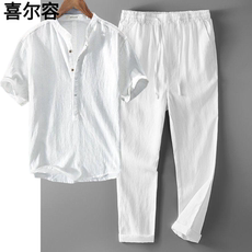 中国风白色棉麻套装短袖t恤男式亚麻裤宽松黑色两件套夏季男唐装