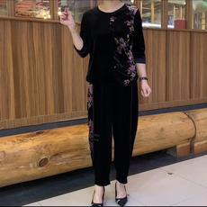 中老年妈妈装春秋新款金丝绒套装女大码宽松遮肚显瘦两件套奶奶装