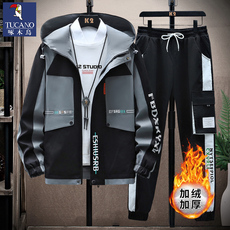 啄木鸟秋冬季外套男士加绒加厚新款夹克青少年套装潮帅气保暖男装