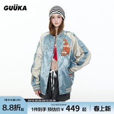 GUUKA潮牌蓝色猫咪刺绣棒球服女秋 撞色拼接外套横须贺夹克插肩袖