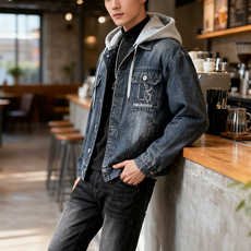 牛仔夹克男士25秋冬新款卫衣连帽假两件潮牌时尚青年休闲加绒外套