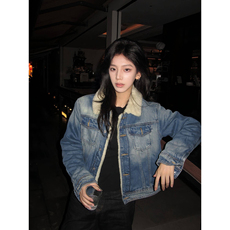 美式复古羊羔绒牛仔夹克男冬季短款廓形工装棉服韩系chic情侣外套