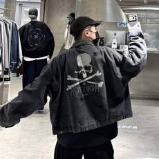 潮牌春季翻领牛仔外套男ins美式复古做旧骷髅头印花宽松青年夹克