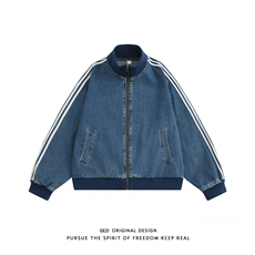 格自美式高街条纹牛仔外套男女潮牌宽松上衣春秋季设计感情侣夹克