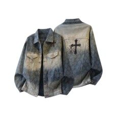美式复古水洗做旧牛仔外套男女春秋季十字架烫钻宽松提花潮牌夹克