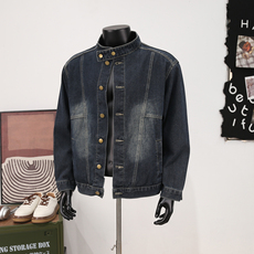 春秋季休闲宽松夹克美式复古解构水洗做旧黄泥染立领牛仔外套男