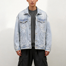 LUCHONG春季潮牌复古做旧牛仔外套男 时尚百搭宽松立领飞机扣夹克