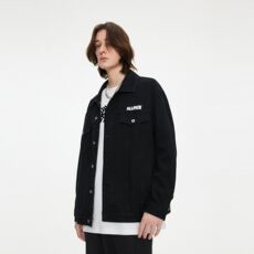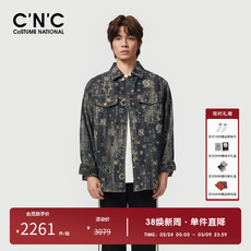 CNC男装奥莱秋季新款满版提花LOGO图案潮流翻领口袋牛仔夹克男