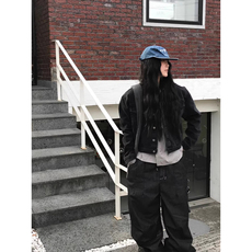 特叔时尚深蓝拼皮排扣复古衬衫牛仔夹克春秋外套休闲宽松短款美式