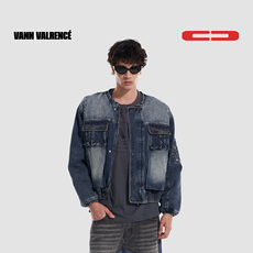 VANN VALRENCE水洗做旧擦色无领结构设计短款牛仔夹克棉服外套