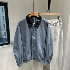 复古灯芯绒领口拼接牛仔上衣男潮牌做旧水洗翻领美式工装夹克外套