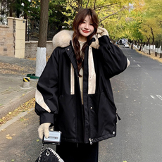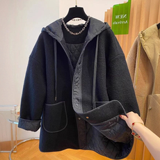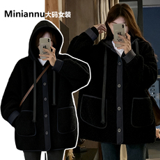 300斤大码女装黑色羊羔毛厚外套女胖mm时尚百搭宽松连帽保暖棉服