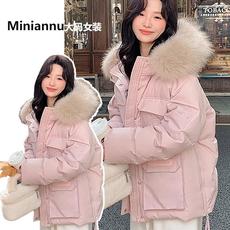 胖mm大码女装奶呼呼大毛领棉服女浅色系保暖加厚显瘦连帽冬装外套