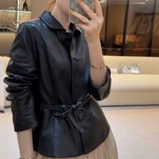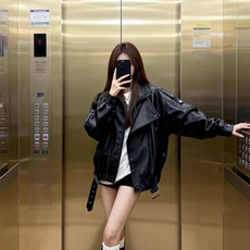 辰米范【现货7折】酷飒风翻领皮衣外套女高级感腰带pu皮夹克秋冬