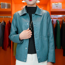 2025春季时尚纯色翻领pu水洗皮外套女G妈妈装洋气显瘦休闲皮衣