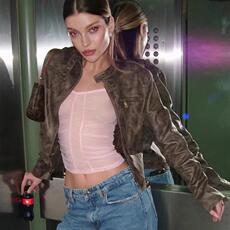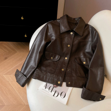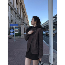 2025秋冬新款辣妹美式复古做旧咖啡色短款夹克外套百搭立领PU皮衣