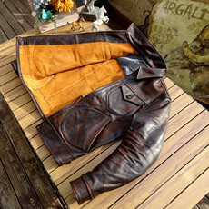 1920S美式复古重水洗做旧擦色孟加拉茶芯小牛皮真皮衣短款皮夹克