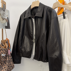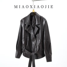 复古酷飒风翻领小羊皮真皮皮衣外套女春秋美式短款宽松机车皮夹克