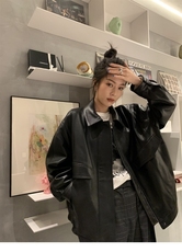下摆抽绳PU皮衣外套 韩国正品PARTIMENTO 宽松休闲复古立领皮衣