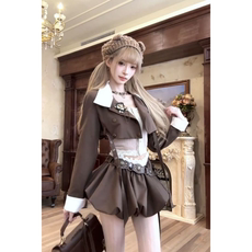 牙套大汪【神女微微安】塔林灰赫敏羊毛呢料学院西装花边半裙套装