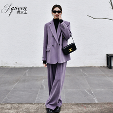 灯芯绒西装套装女冬保暖复古职场高级感紫色西服外套直筒裤两件套