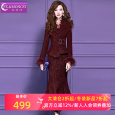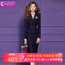 菲梦伊亮片小香风套装女冬季轻奢名媛加厚西装领毛呢外套职业半裙