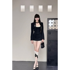 IN MIMIFACE 黑色丝绒西装套装女收腰上衣性感紧身纯欲裙裤两件套