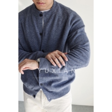 YUXIAN意式100%羊毛蓬松粗纺圆领针织开衫休闲商务复古毛衣秋冬季