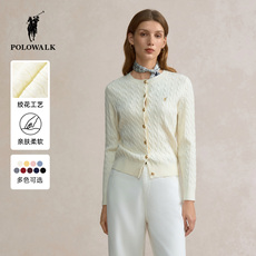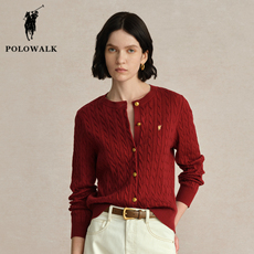 POLOWALK女式针织衫2026春季新品绞花毛衣圆领针织开衫红色毛衣女