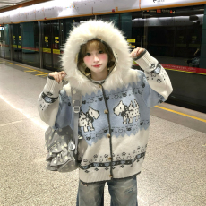 加厚版!复古牛角扣卡通毛衣开衫女春季新款韩版宽松百搭针织外套
