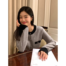 韩系温柔风格纯色金属扣简约短款针织长袖开衫v领毛衣女秋冬上衣