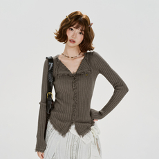 solighter 100%羊毛双层撞色木耳边针织开衫女秋冬新款内搭针织衫