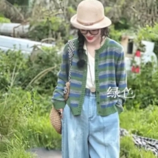 原创【98703】秋季新款时尚复古百搭圆领条纹长袖针织短款开衫