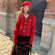冬季绵羊毛沙漏领桂花针花纱长袖针织开衫