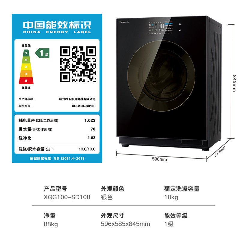 松下10公斤嵌入式镜面屏除菌洗烘干一体滚筒洗衣机XQG100-SD108