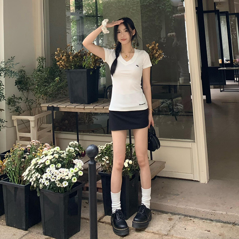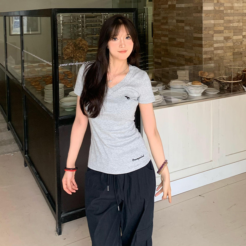 橘子树在哪儿v领刺绣收腰短袖T恤