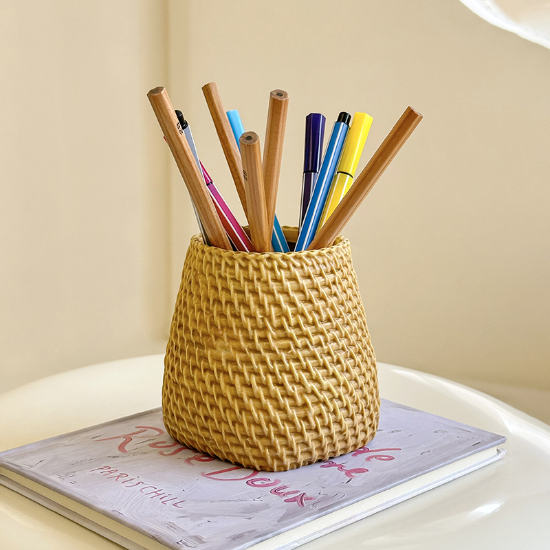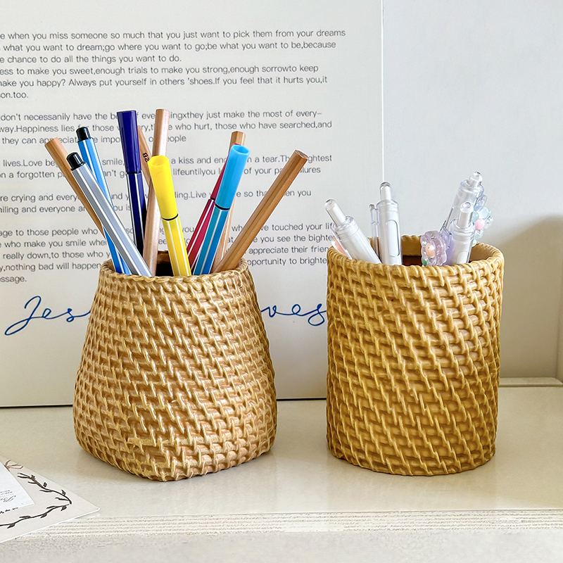 创意复古仿藤编笔筒化妆刷眉笔收纳盒办公室桌面艺术感装饰品摆件