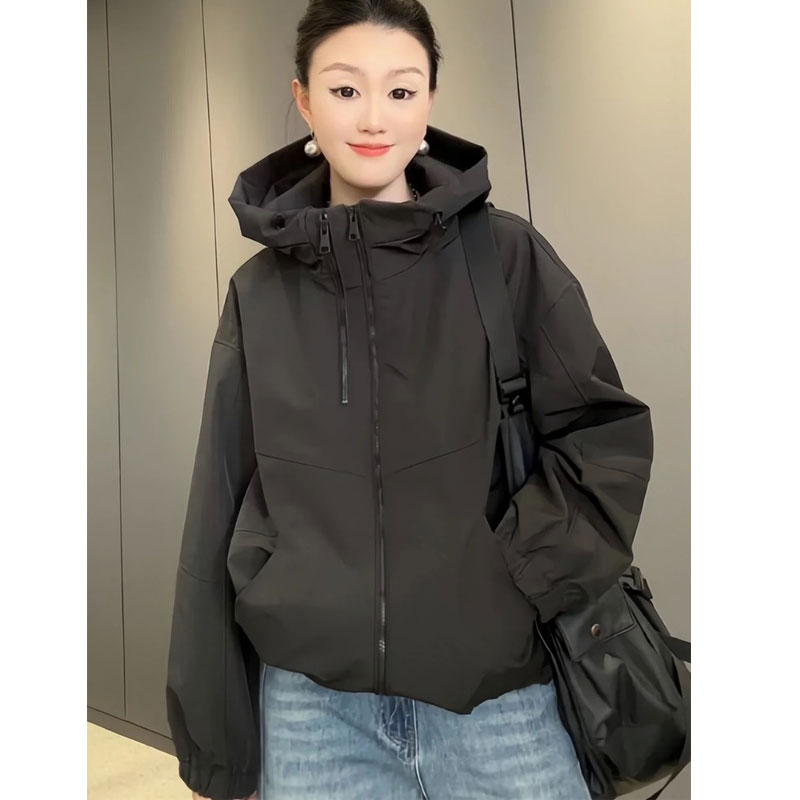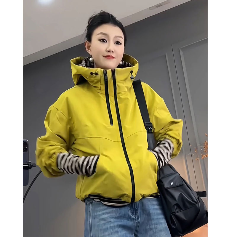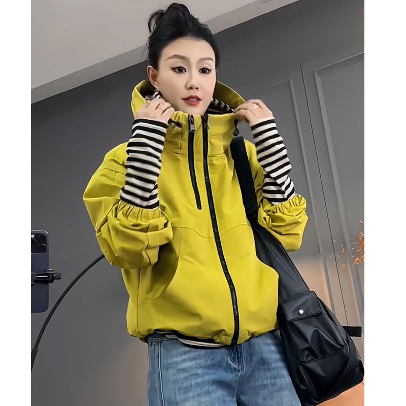 欧货黄色冲锋衣外套女春秋2025新款宽松洋气百搭工装短款连帽风衣