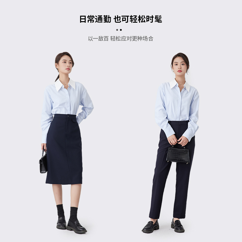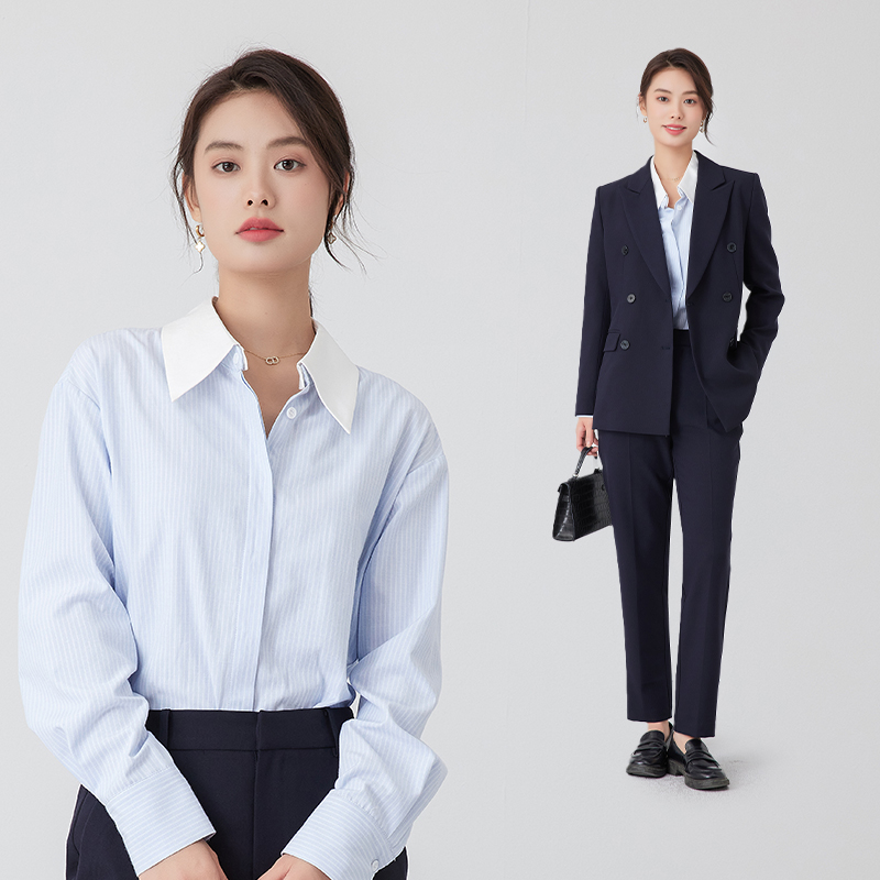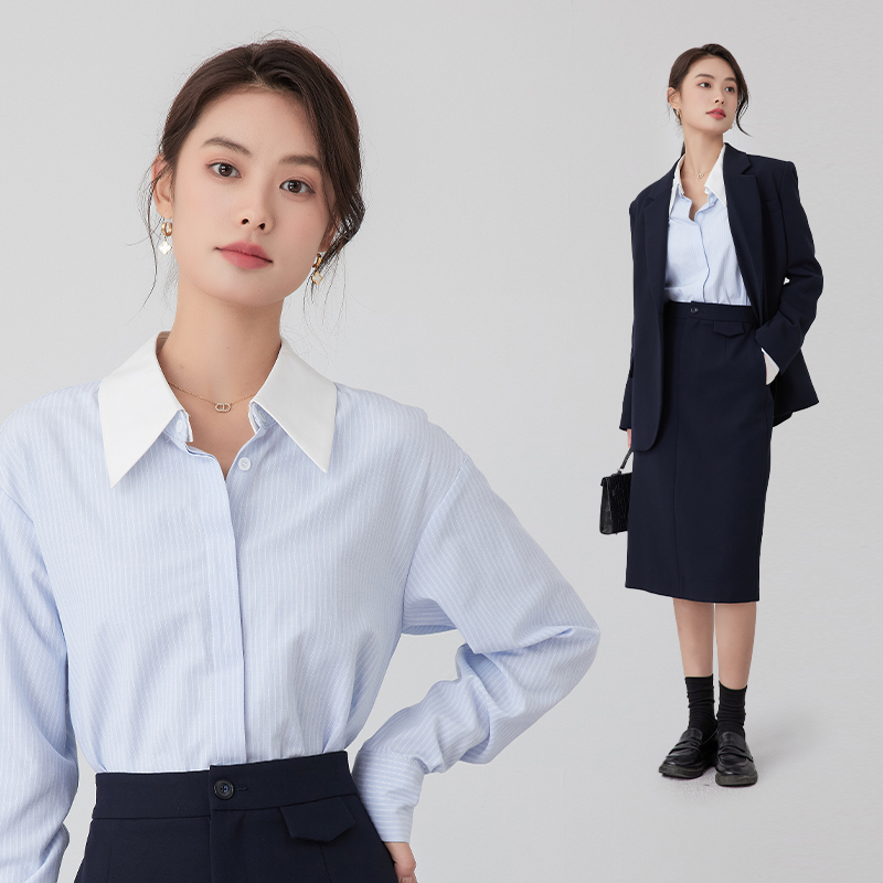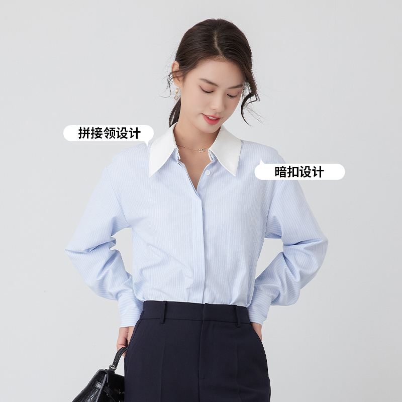 达佳诗蓝色条纹衬衫女春秋季长袖上衣职场面试上衣西装内搭衬衣