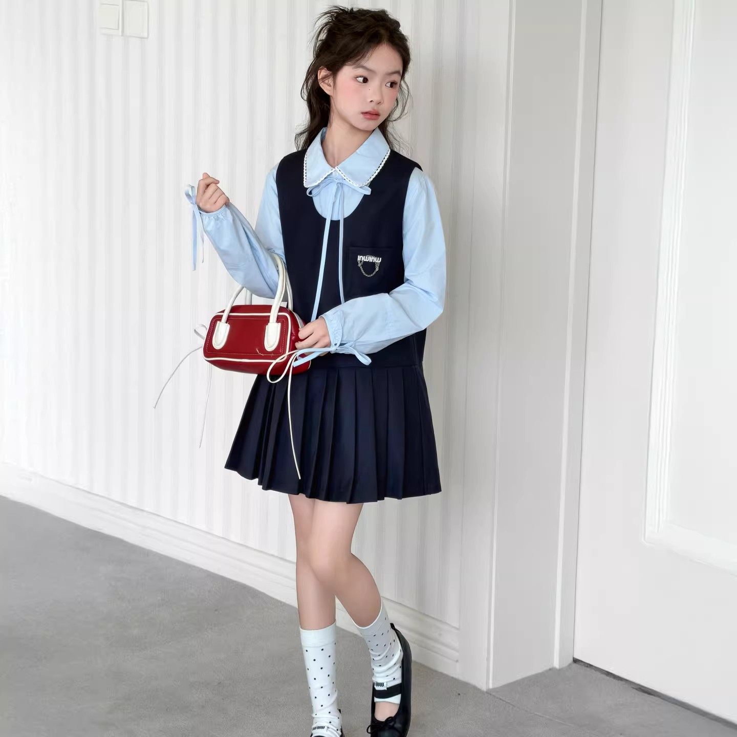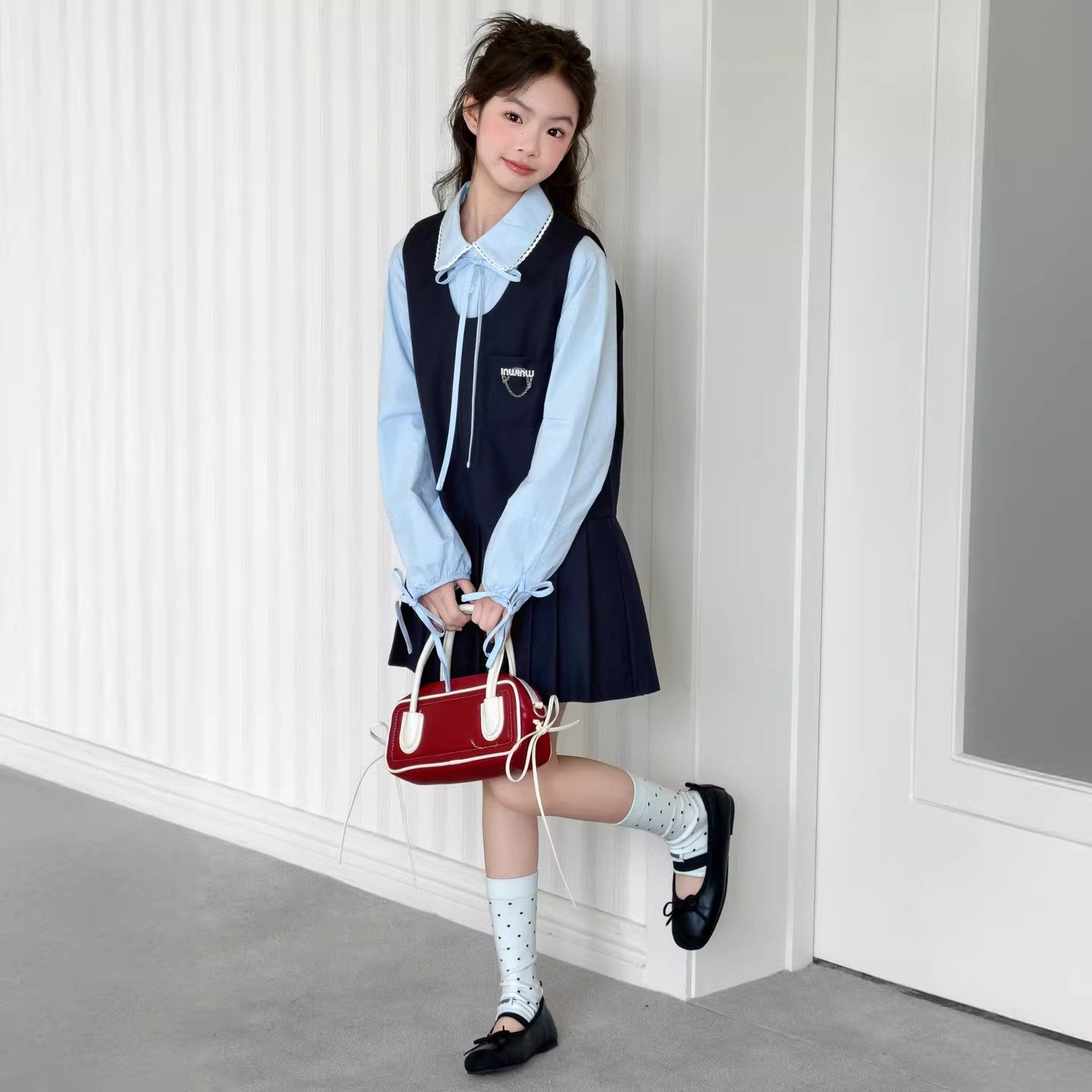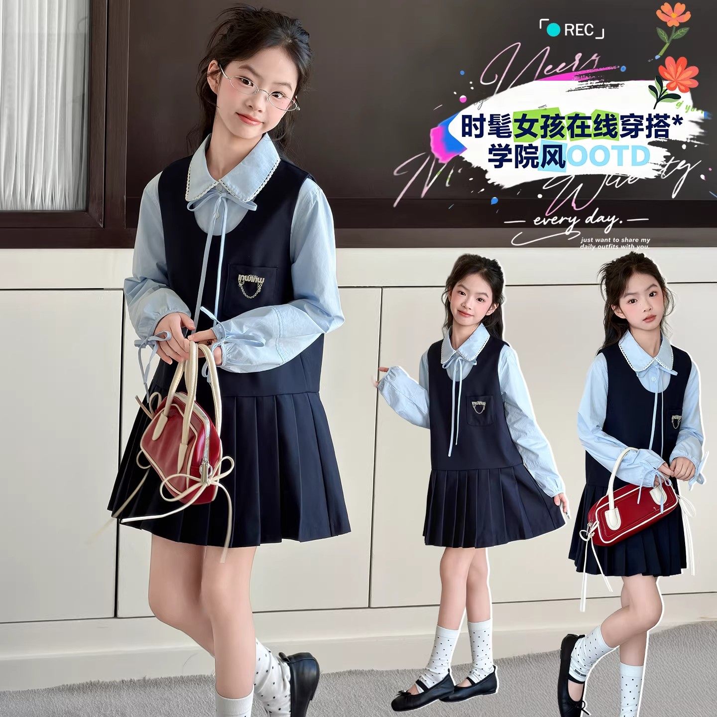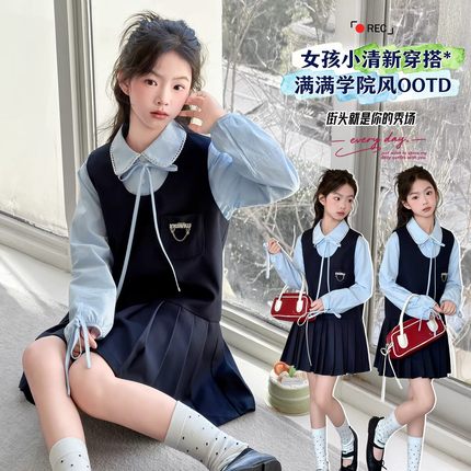 女童韩系学院风连衣裙2026春季新款儿童娃娃领衬衫设计感背心裙子