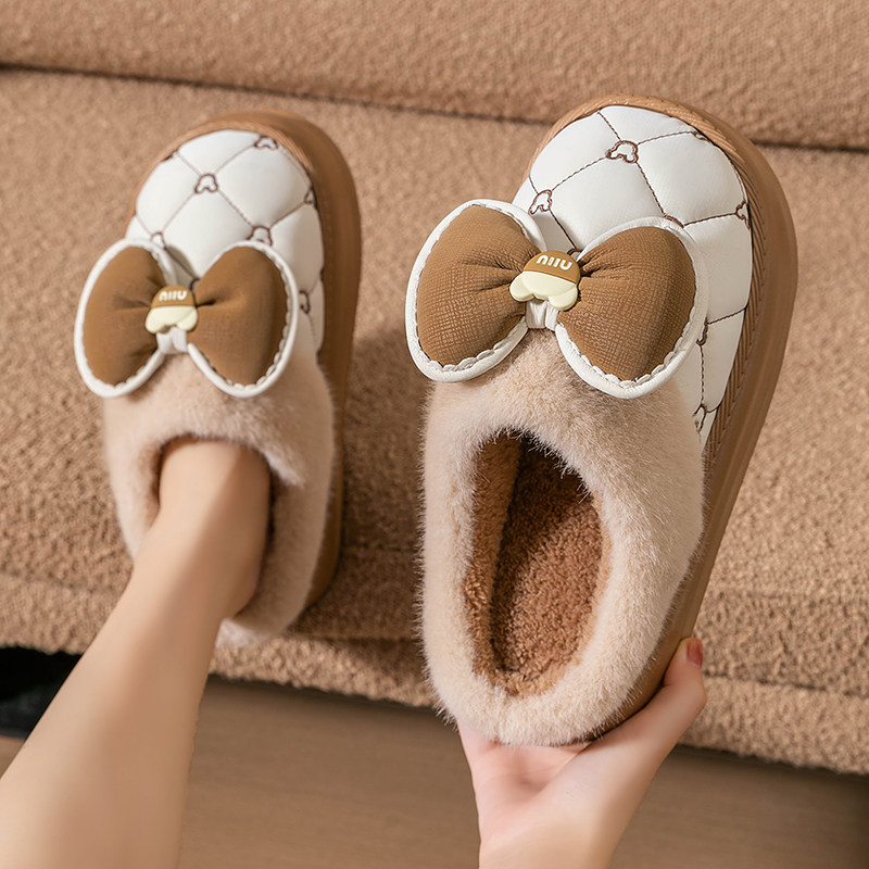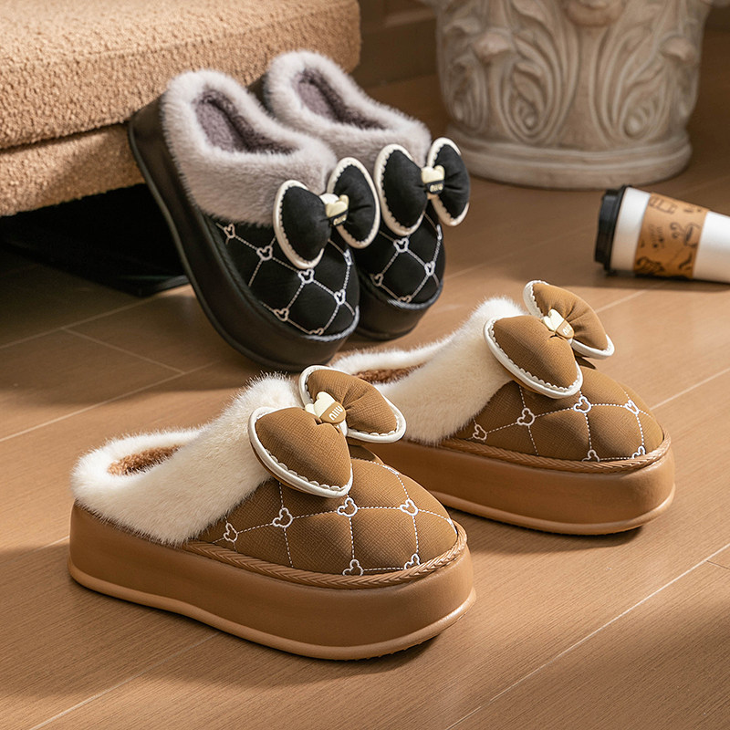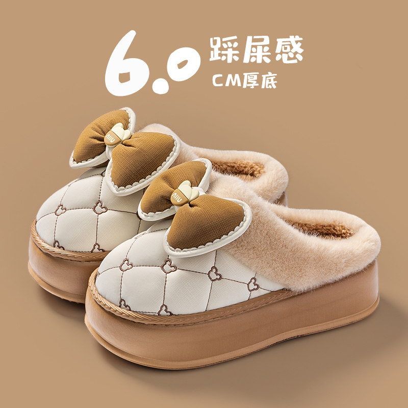 厚底棉拖鞋女高跟家用可爱蝴蝶结高颜值PU皮拖鞋冬季加厚保暖外穿