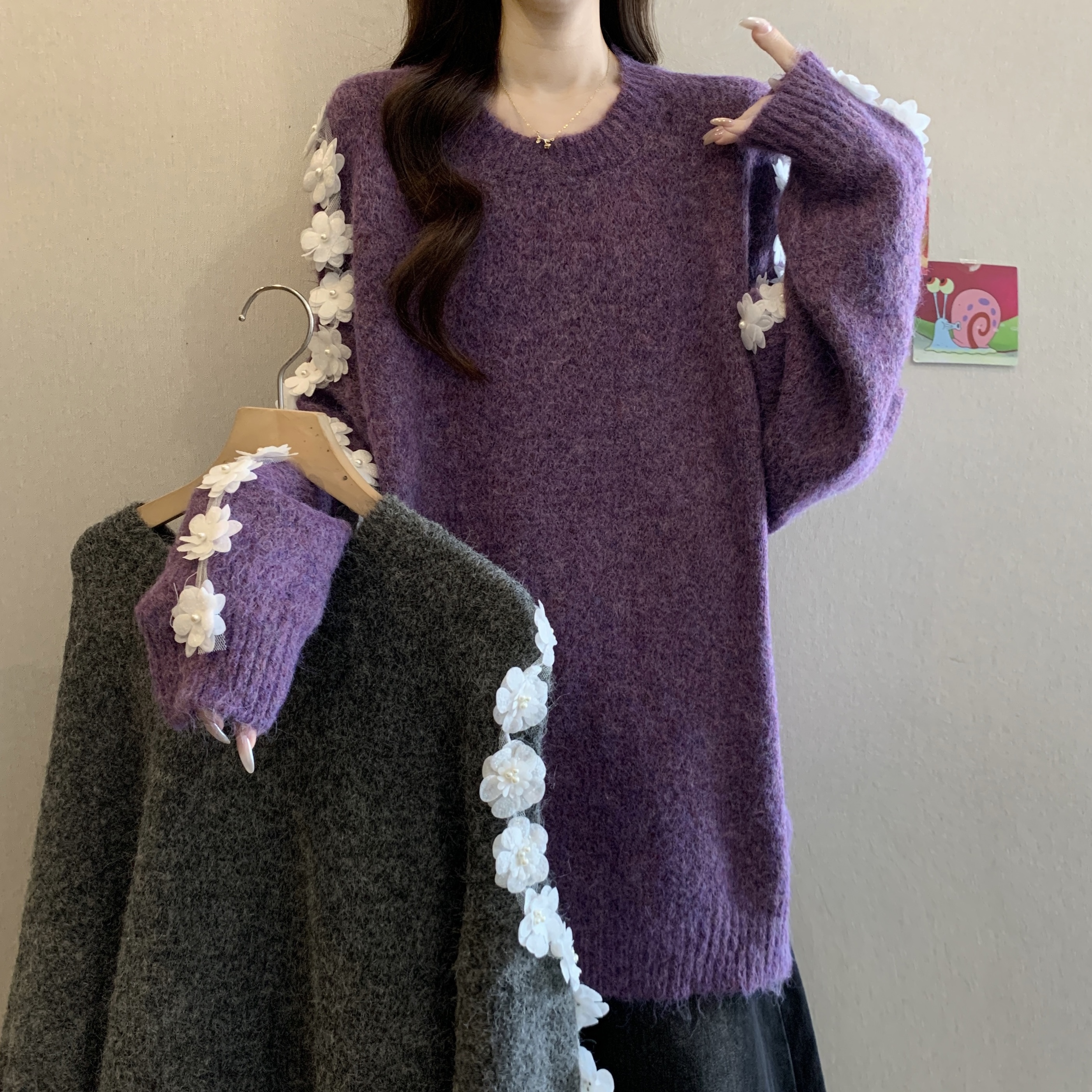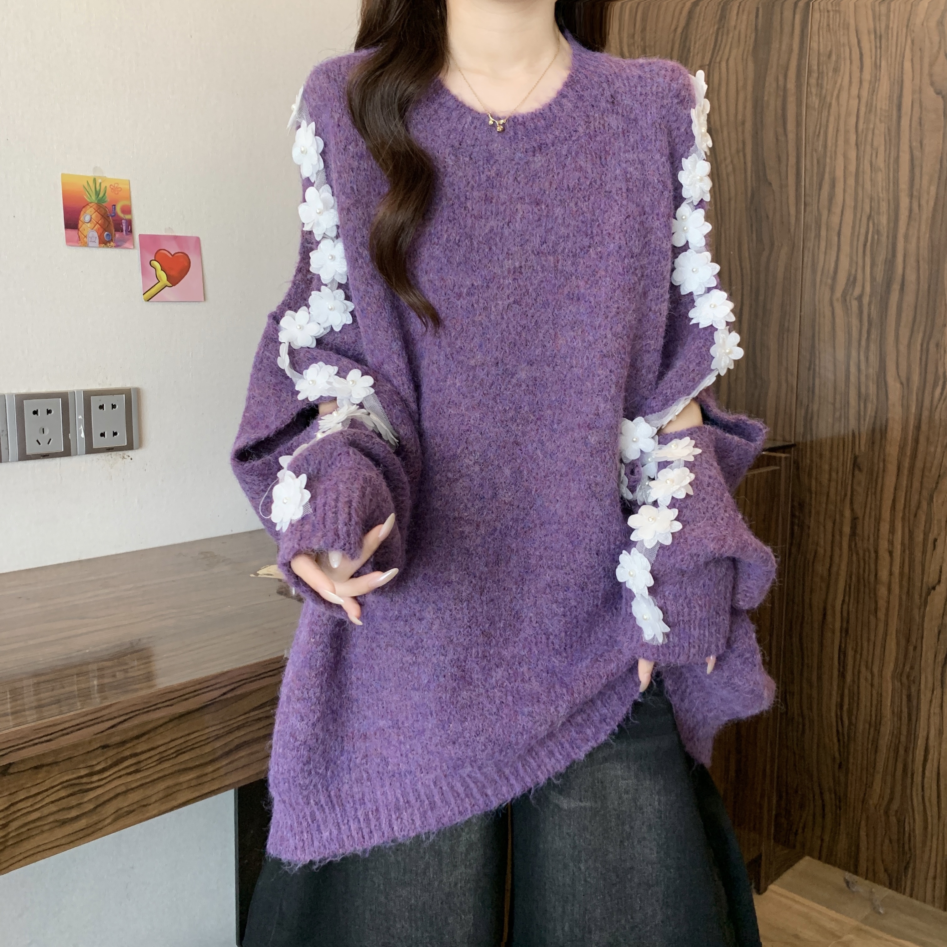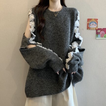 超好看花朵漏肩灰色针织衫毛衣女2025秋冬新款大码胖mm中长款上衣
