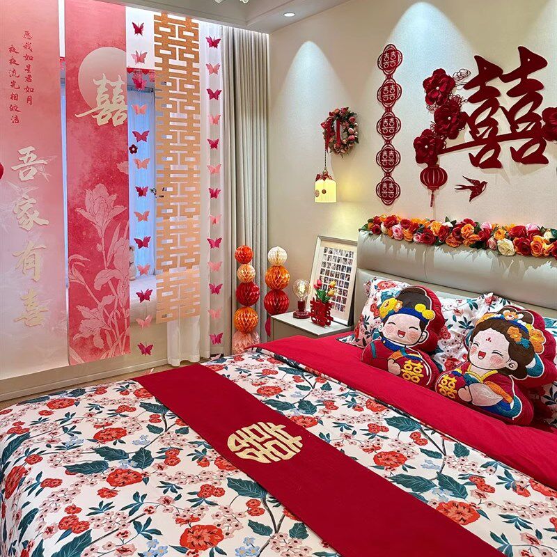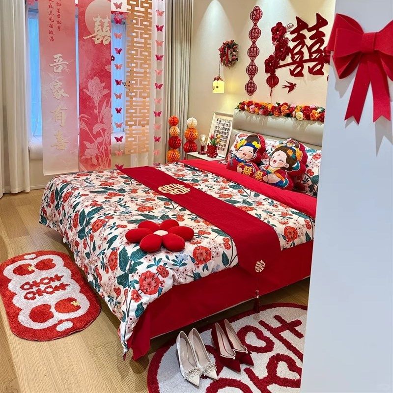 简约印花100支婚庆四件套2025新款红色被套新婚床单V结婚床上用品