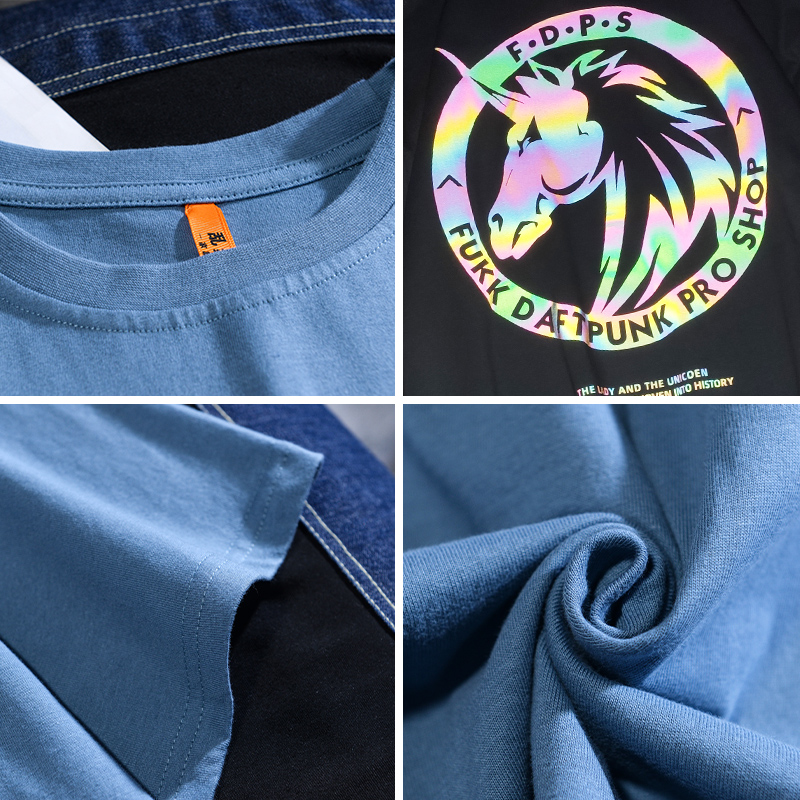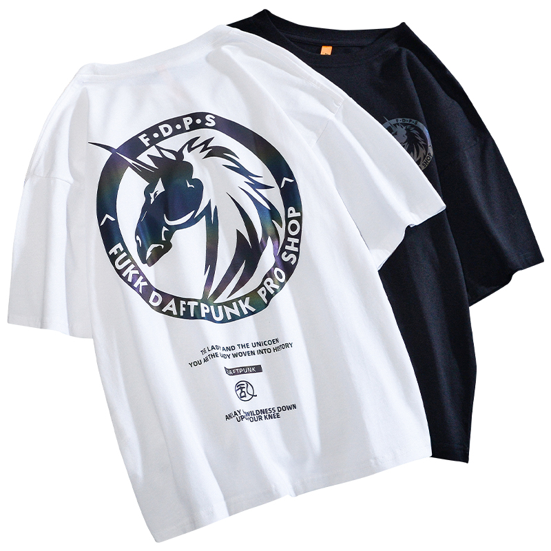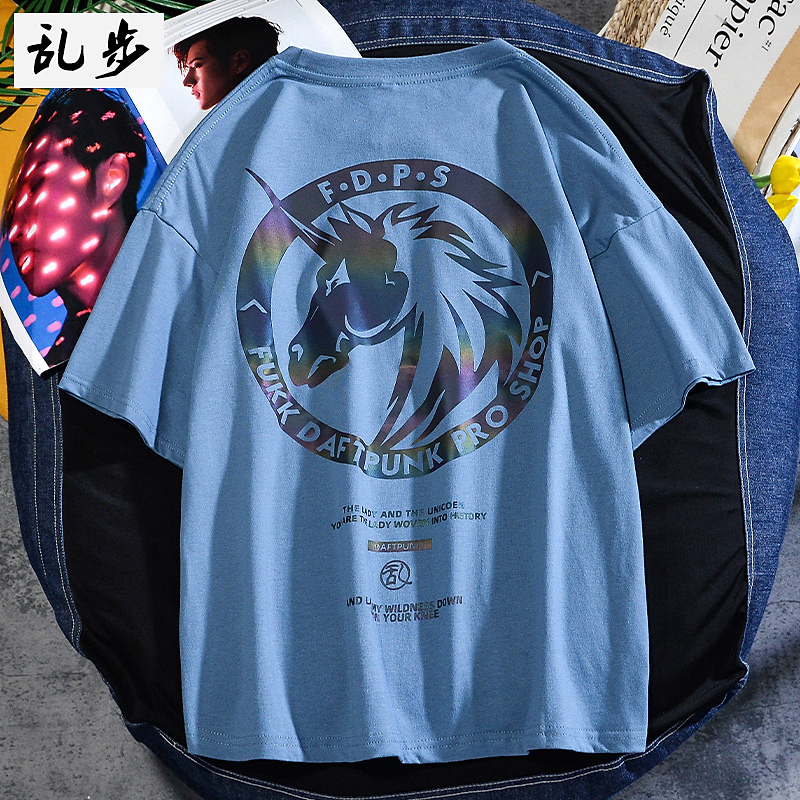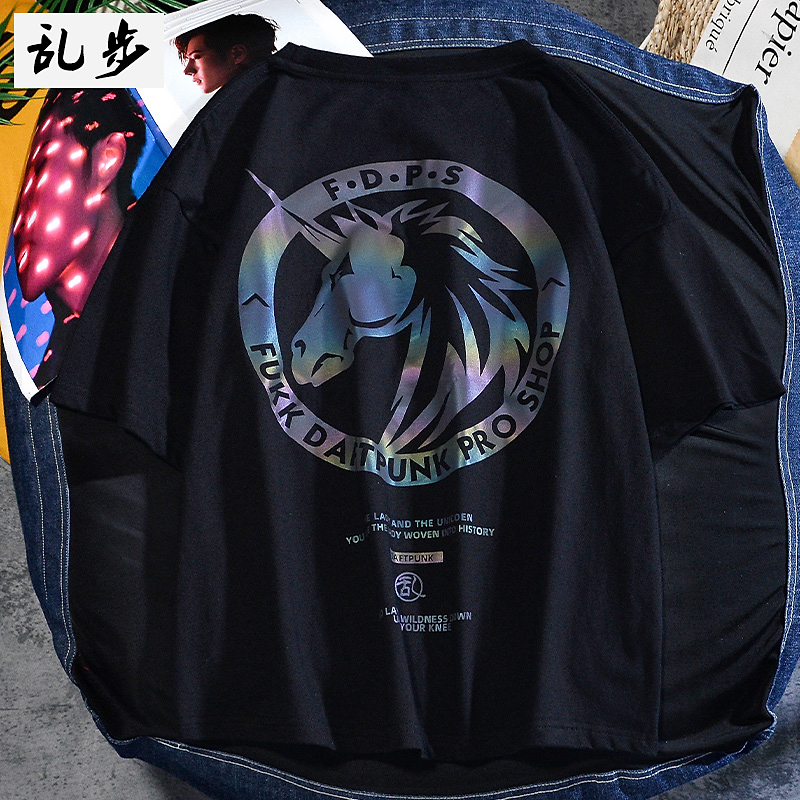 乱步潮流镭射炫彩反光印花短袖T恤男士夏季宽松运动纯棉半袖体恤