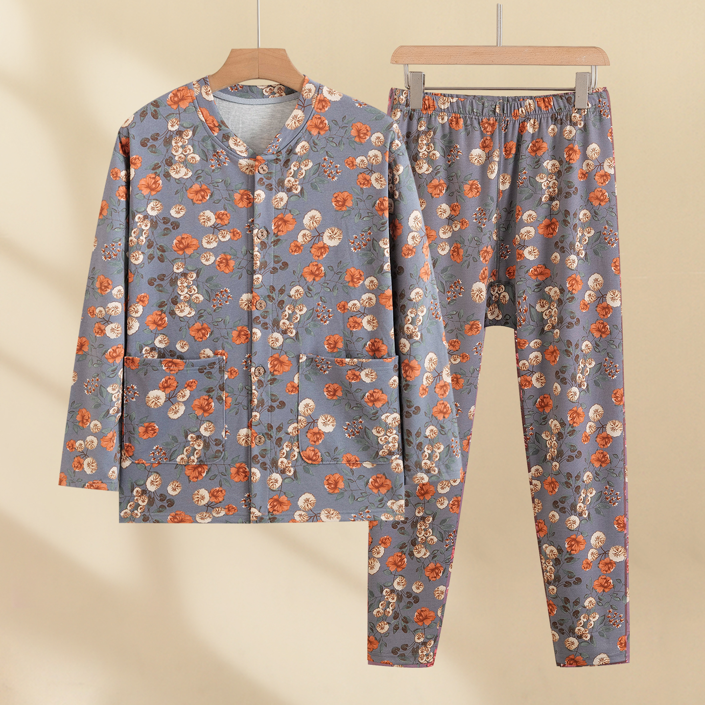 中老年女德绒碎花开衫秋衣秋裤妈妈系扣保暖内衣套装加厚打底上衣