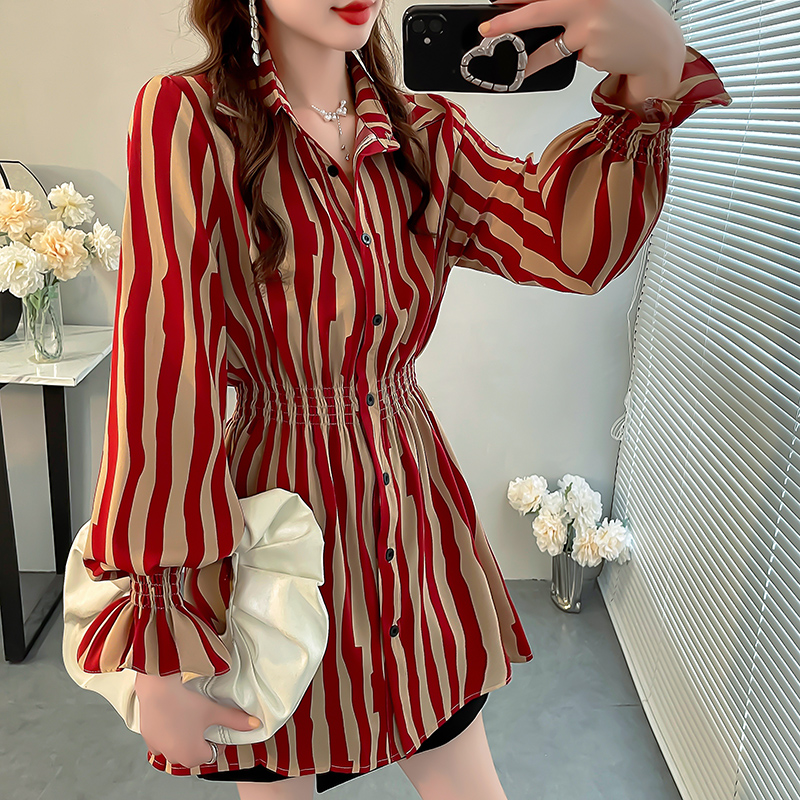 秋季红色条纹印花中长款衬衫上衣女别致显瘦松紧腰喇叭袖雪纺衬衣