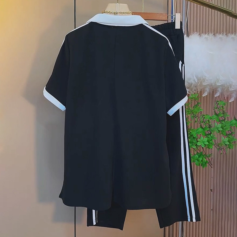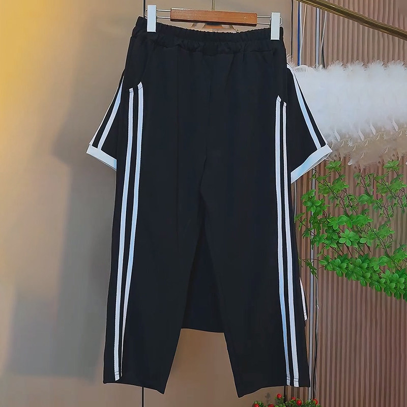 大码条纹半袖T恤衫长裤两件套胖MM夏季新款短袖上衣裤子韩版套装