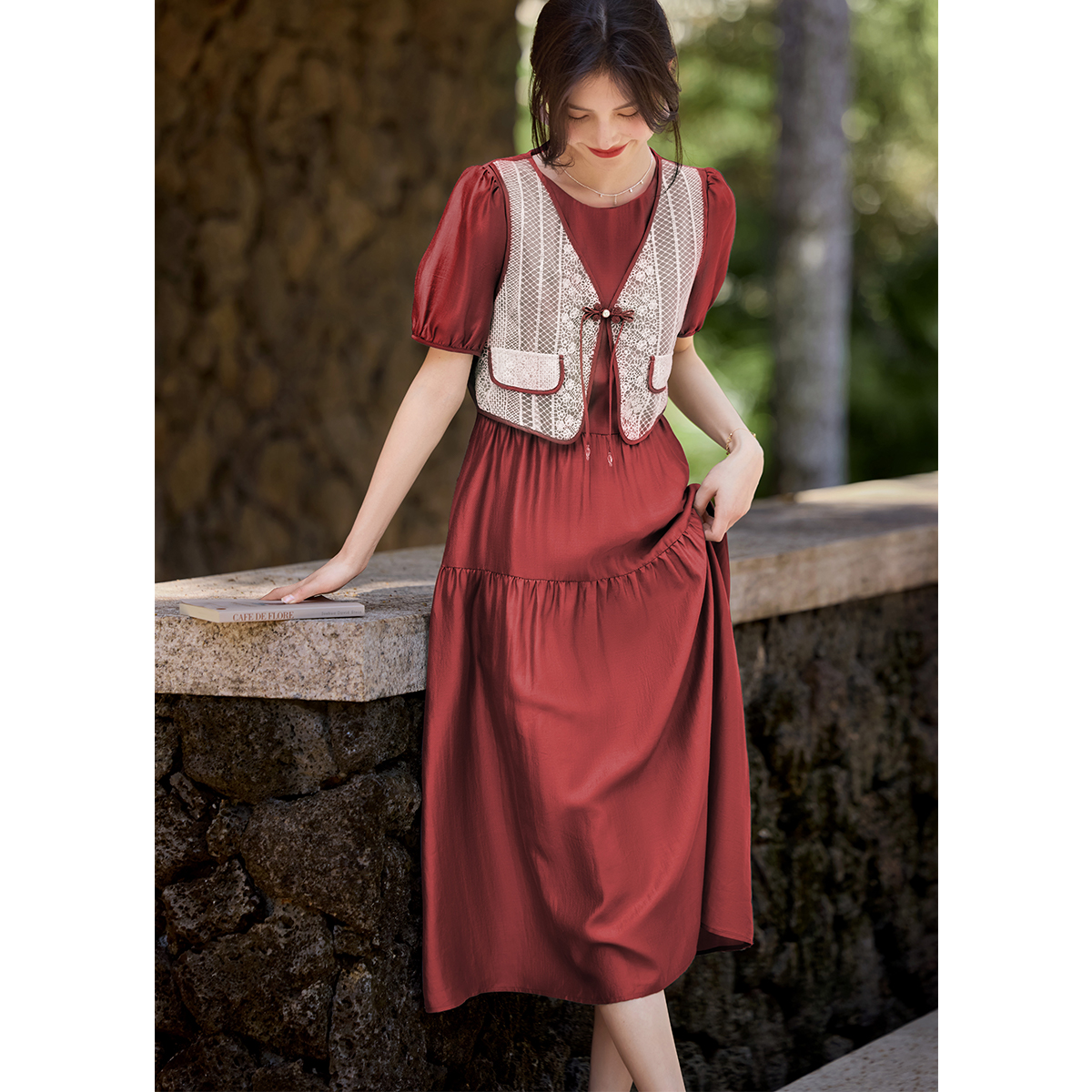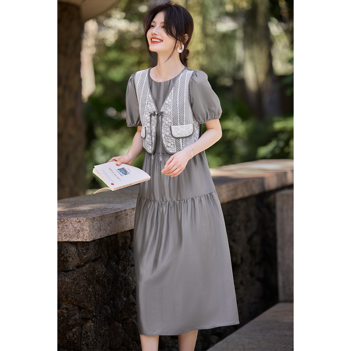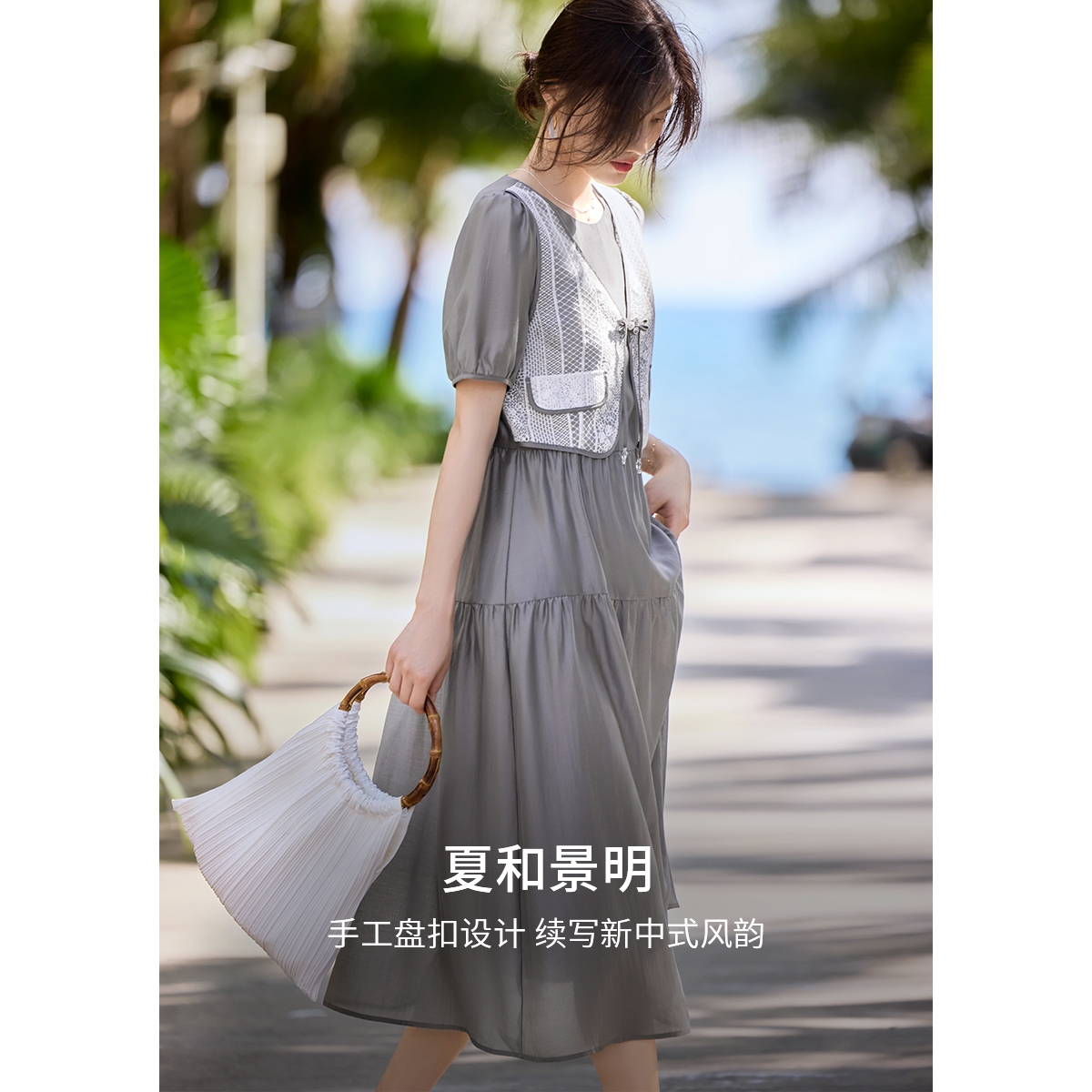 XWI/欣未假两件连衣裙女夏季优雅气质蕾丝马甲拼接设计感显瘦裙子
