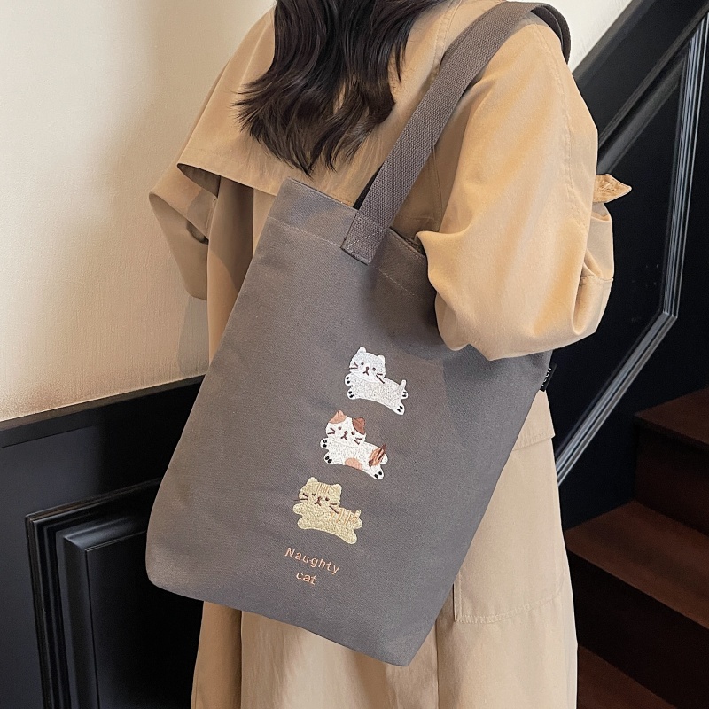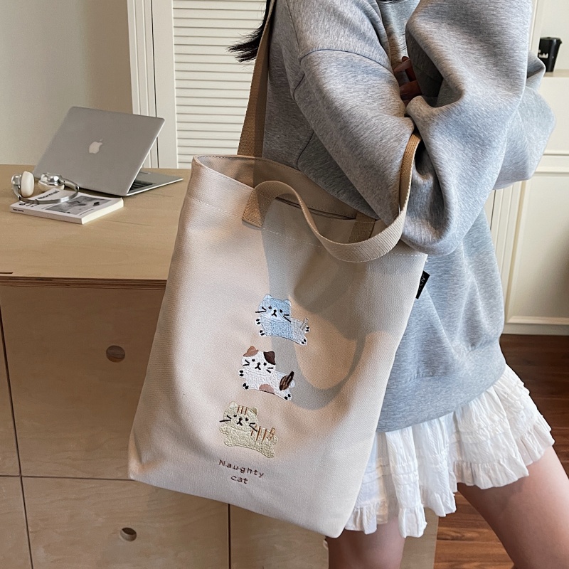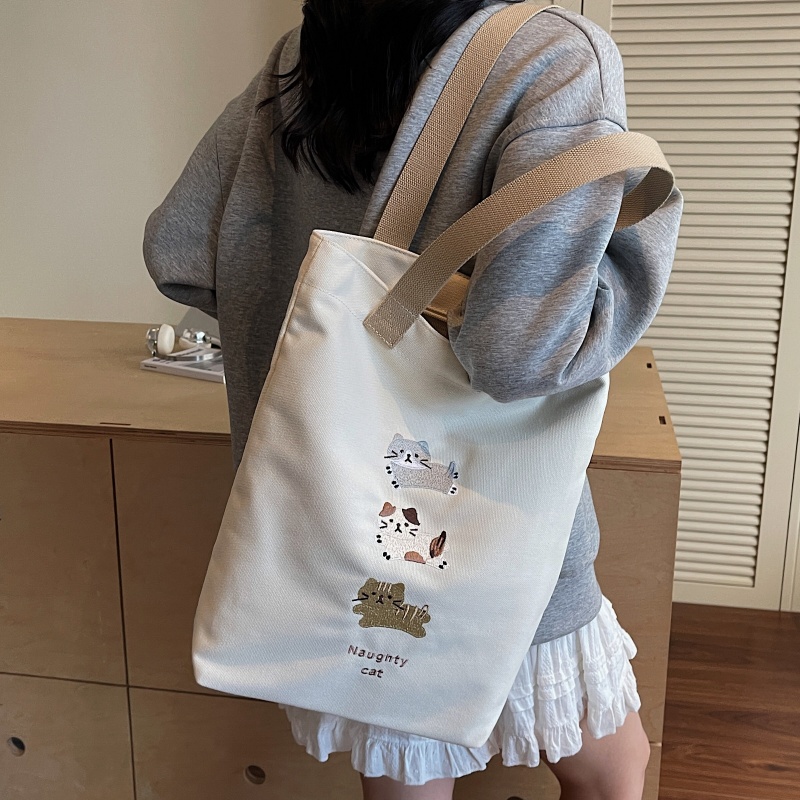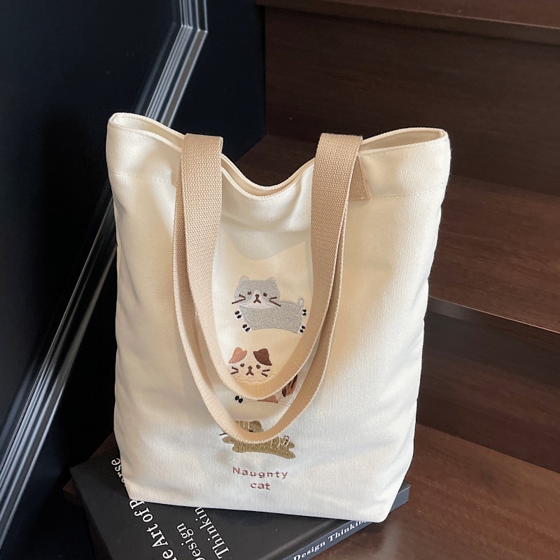 小众刺绣卡通帆布包女夏大容量通勤手提袋百搭学生上课单肩托特包