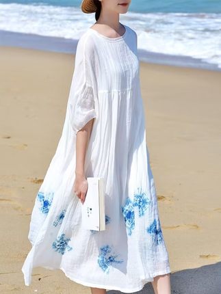双层连衣裙女夏季新慵懒风棉麻袍子蓝染宽松仙女长裙白色裙子